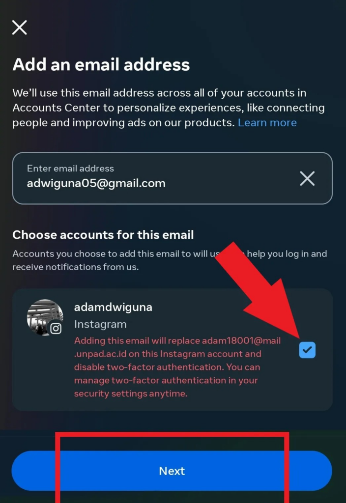 Ketik email baru yang bakal lo pake sebagai pengganti. Pastikan email ini aktif dan bisa lo akses ya gaes. - Klik centang di akun Instagram